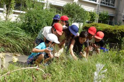 1年1組が中庭で虫探しをしていました。