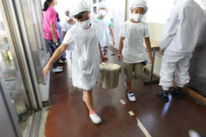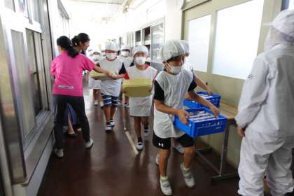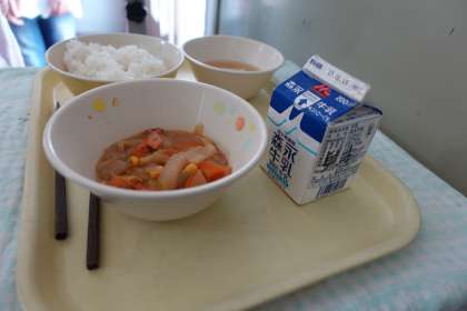 今日の献立は、冬瓜のスープ、ちゃんちゃん焼き、ご飯、牛乳です。