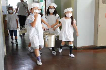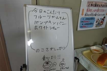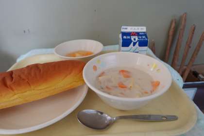 今日の献立は、パンプキンパン、ホワイトシチュー、フルーツ寒天、牛乳でした。