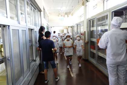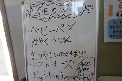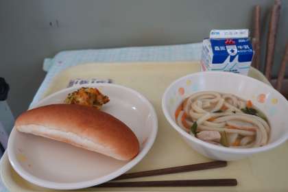 今日の献立は、夏野菜のかき揚げ、ベビーパン、かやくうどん、ソフトチーズ、牛乳です。