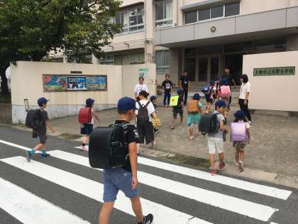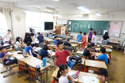 写真は朝の準備をする4年1組です。