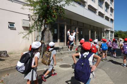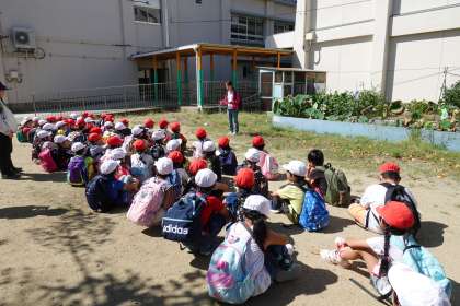 学校へ戻ってくると、ちょうどそうじ時間でした。下足を掃除している6年生が「おかえり」と手を振ってくれました。