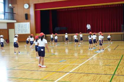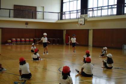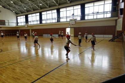 体育館で、2年2組が授業をしていました。みんなよく頑張っています。