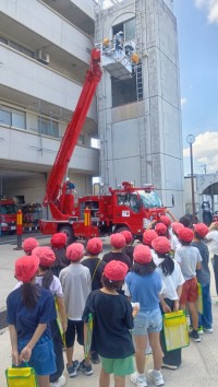高所作業車による訓練や消防服の早着替えなどに子どもたちは大興奮。しょうろ、消防士...
