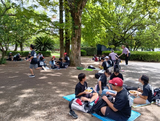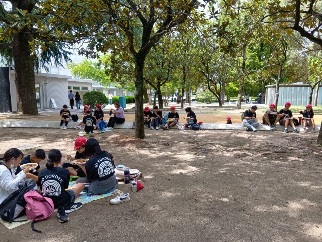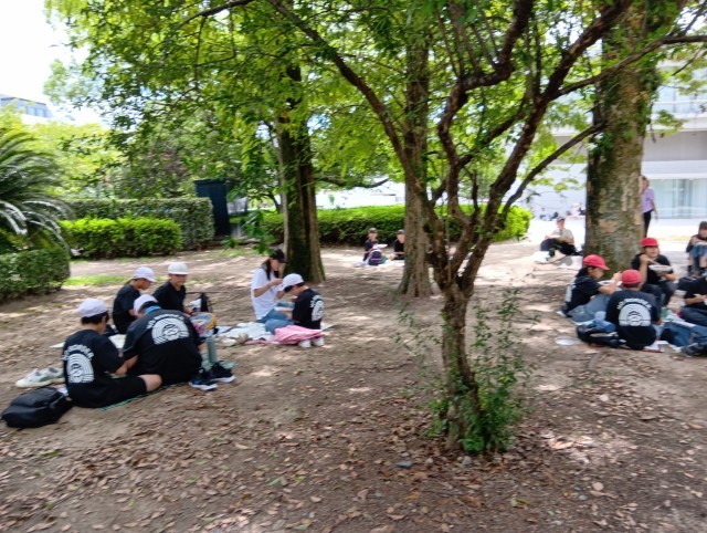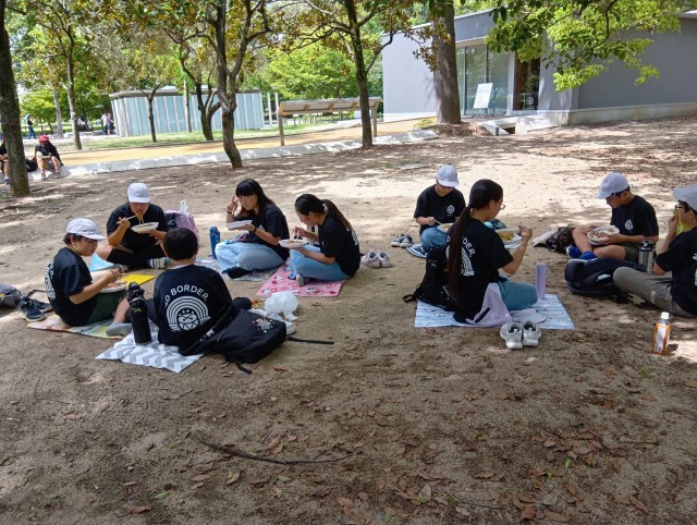 碑めぐりの後は、昼食です。大きなお好み焼きを食べました。広島のお好み焼きはキャベツがたっぷりでおいしいです。