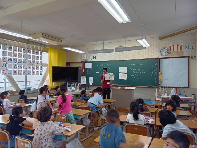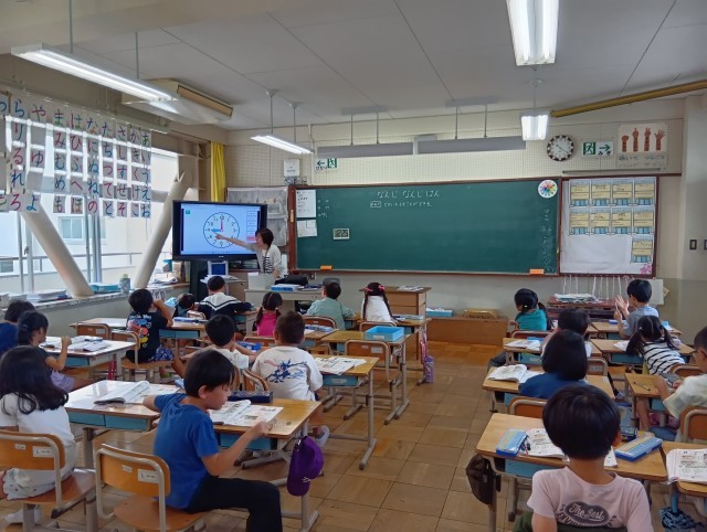 1年生の授業の様子です。図工の作品の紹介をしているクラスと算数で時計のよみの学習をしているクラスの様子です。