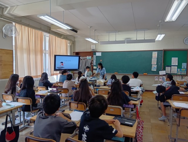 5年生の教室を覗いてみると、外国語でスピーチテストをしていました。パワーポイントを作り、それに合わせて"I can~”の文を話していました。