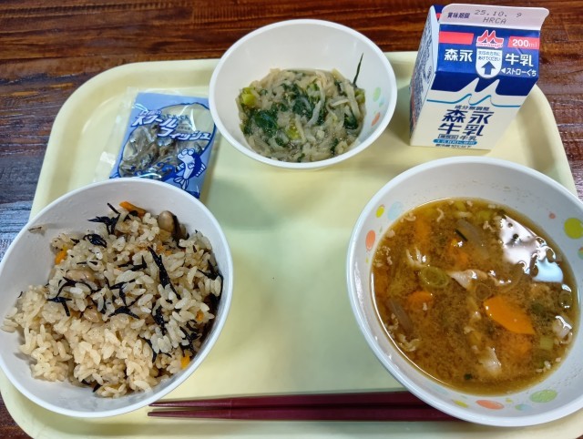 今日の給食は、ひじき大豆ごはん、豚汁、切り干し大根のごまあえ、ミニフィッシュ、牛乳です。