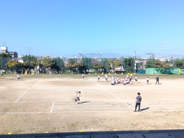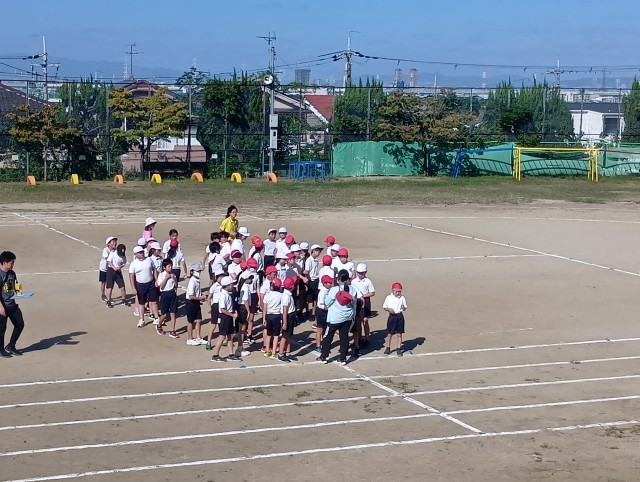 写真は、5年生が運動場でリレーの練習、6年生が体育館で組み立て体操の練習をしている様子です。