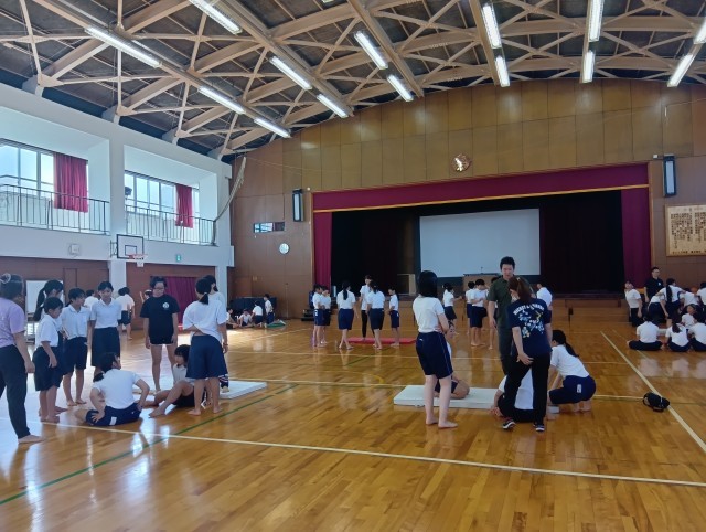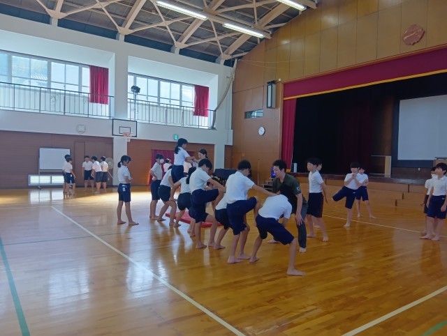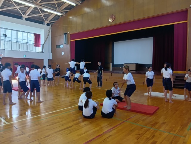 6年生の組み立て体操の練習では、教員がそばで補助をしたり見守ったりしながら、怪我のないように進めています。