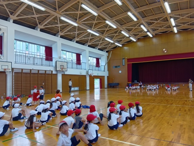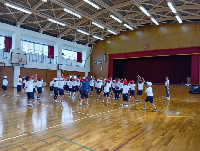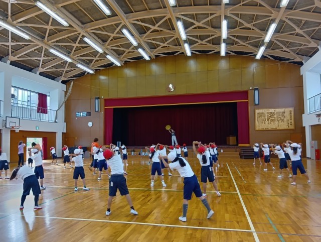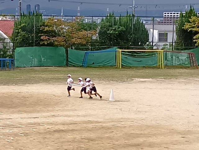 写真は、2年生のダンス、1・2年生のデカパン競争、4年生は台風の目、3年生はダンスの練習でした。