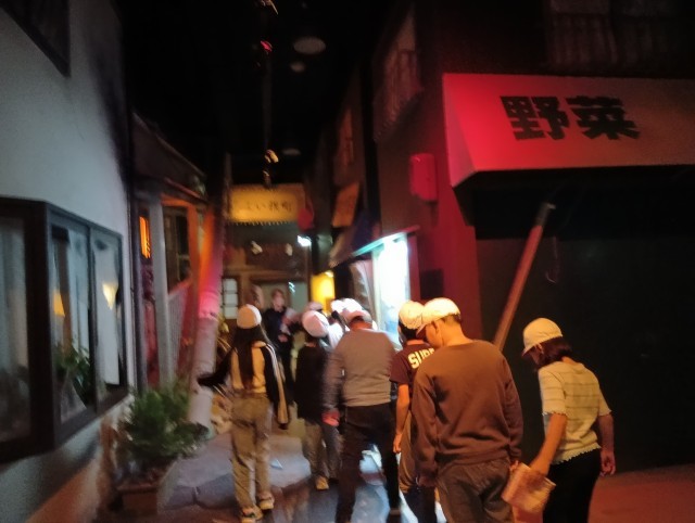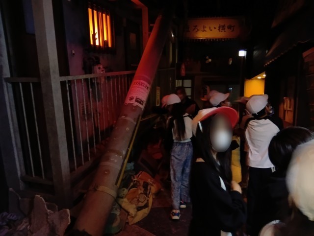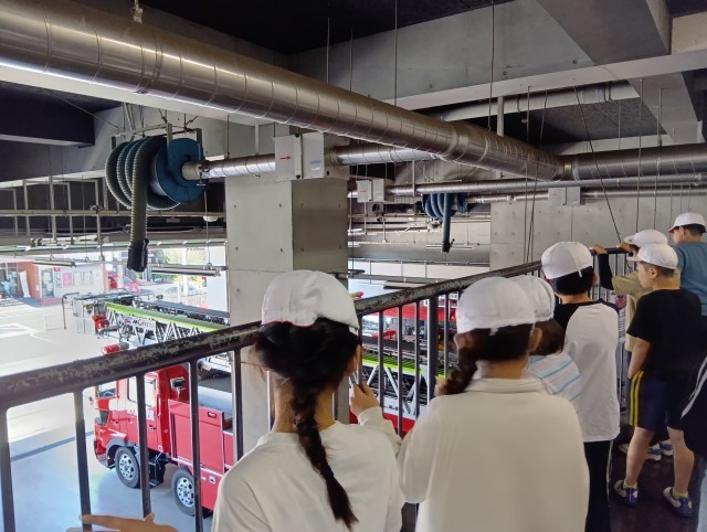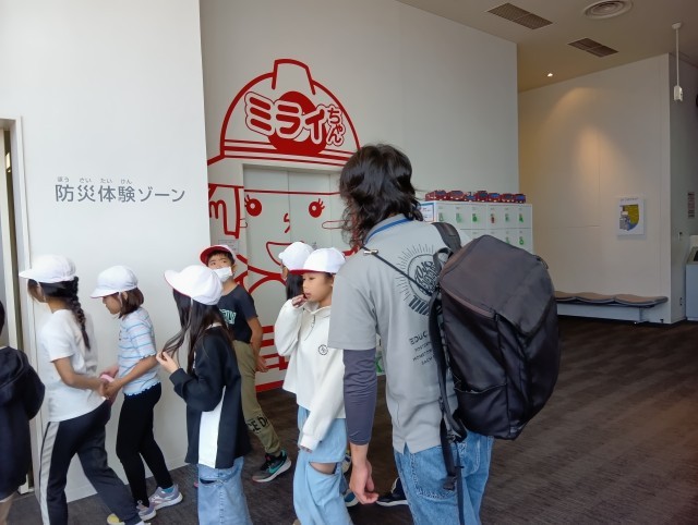 次に、東大阪市防災センターの見学・体験です。火事になったときの避難の仕方を無害な煙を出して体験しました。やじるしや非常口の表示を探しながら壁を片手でさわり、鼻と口はハンカチでふさぎ体をかがめて避難しました。そのほかに、地震が起きたときの町を再現したところを歩きました。どこに気をつけて歩けばよいか、看板やガラスなど落ちてこないか考えながら歩きました。震度2~6のときの揺れや阪神淡路大震災、東日本大震災のときの揺れも体験しました。最後に消防署の指令室や消防車を見学しました。話や映像だけでなく実際に体験したことは、記憶に残りやすいと思います。今日体験したことを、今後の防災の学習に活かしていってほしいです。