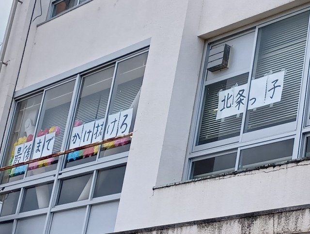 運動会の児童会目標が校舎の窓に貼られています。今年の児童会目標は「最後まで かけ抜けろ 北条っ子」です。