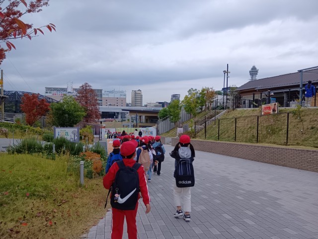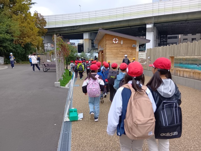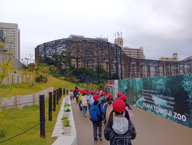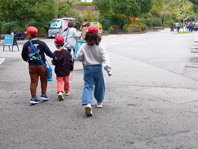 動物園内は、工事をしているところがあって、迷路のようです。荷物を置いたら、班で見て回ります。うきうきと班のみんなで出発です。