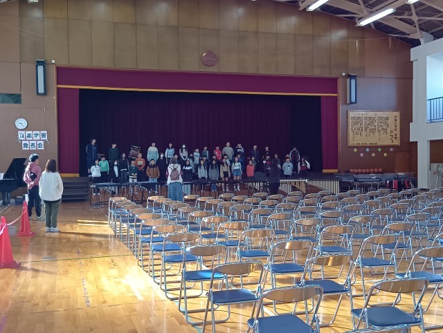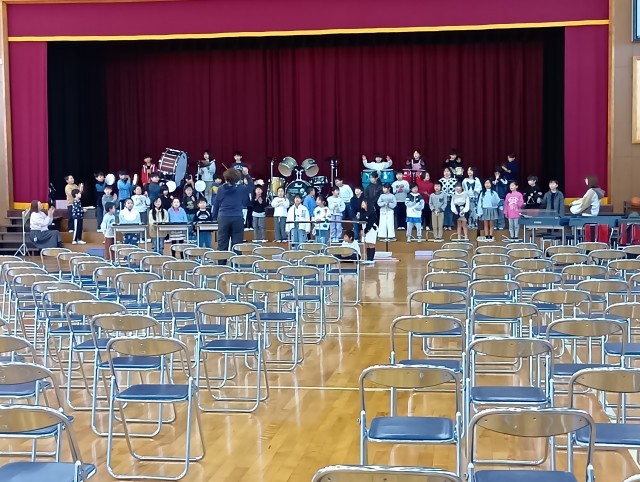 明日は、保護者参観の音楽学習発表会です。昨日のうちにいすを5年生が並べてくれました。