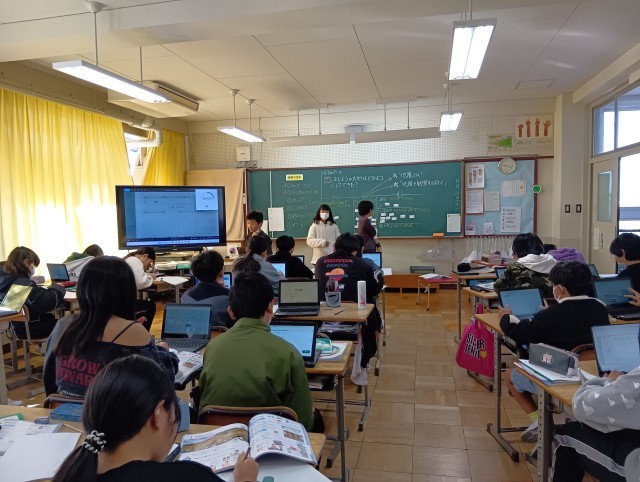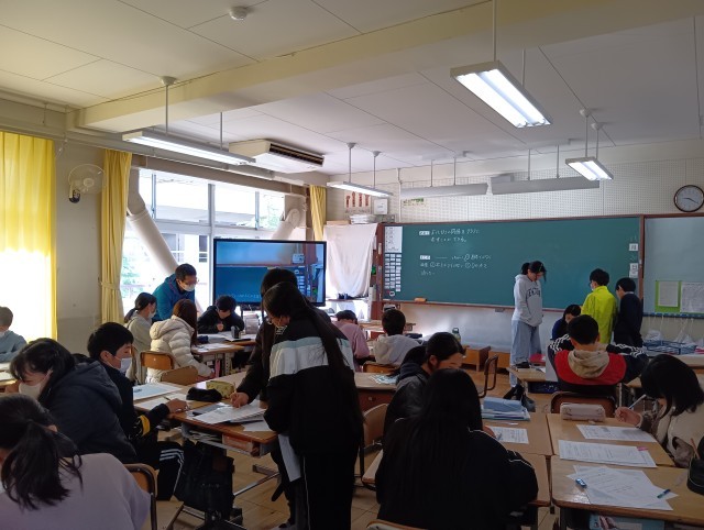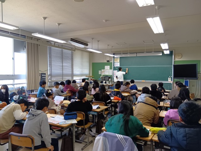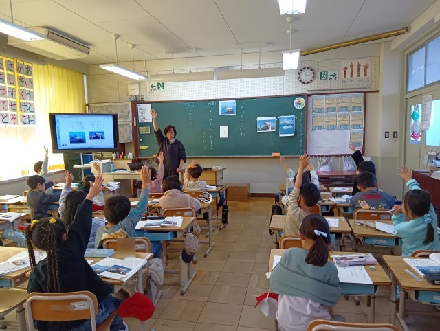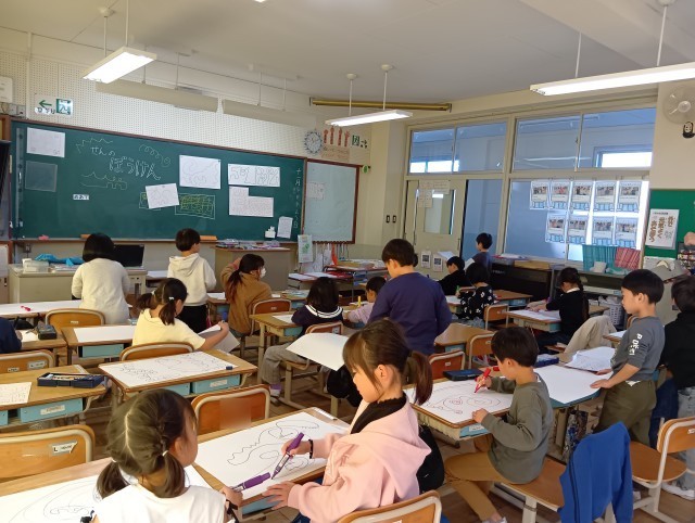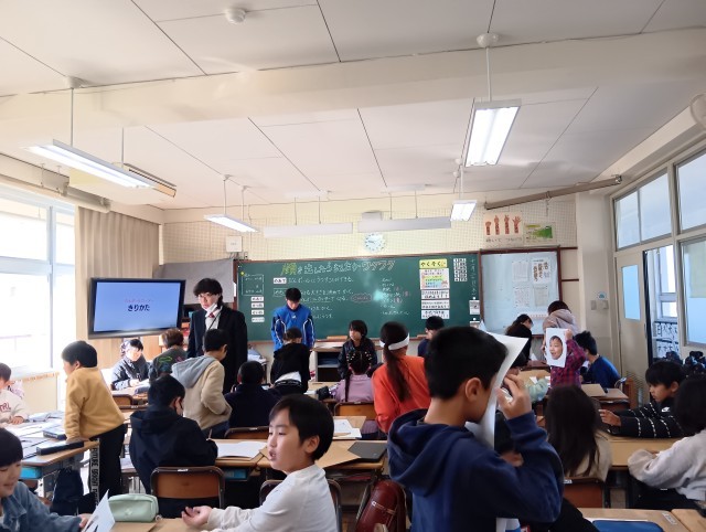 教室では、1年生は図工と国語。3年生は図工「顔を出したらなんだかワクワク」という学習でした。顔を出すのに「これくらいかな?」と話しながら試していました。
