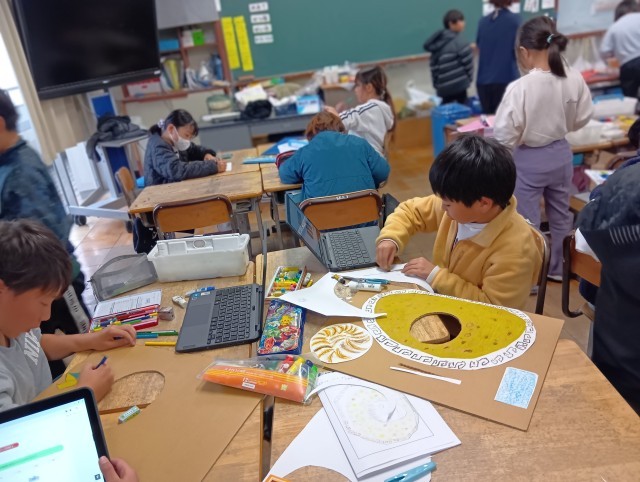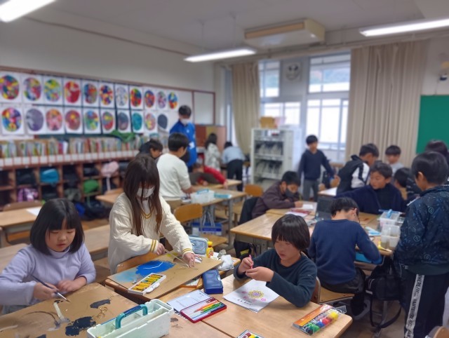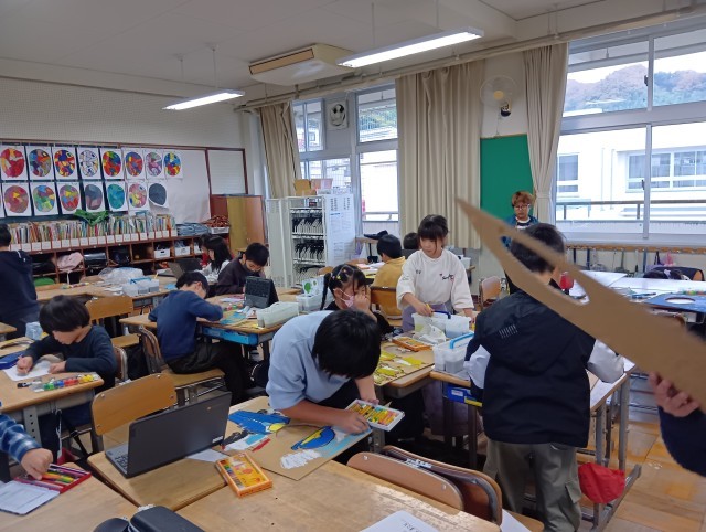 3年生の教室を覗いてみると、図工「顔を出したらなんだかワクワク」の続きで、今日は絵具で色を塗って仕上げていました。ダンボールに丁寧に絵具で色を塗り、みな満足のいく出来栄えでした。