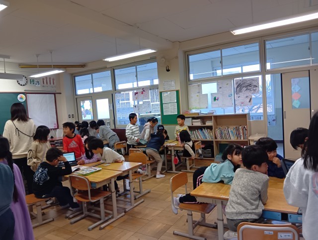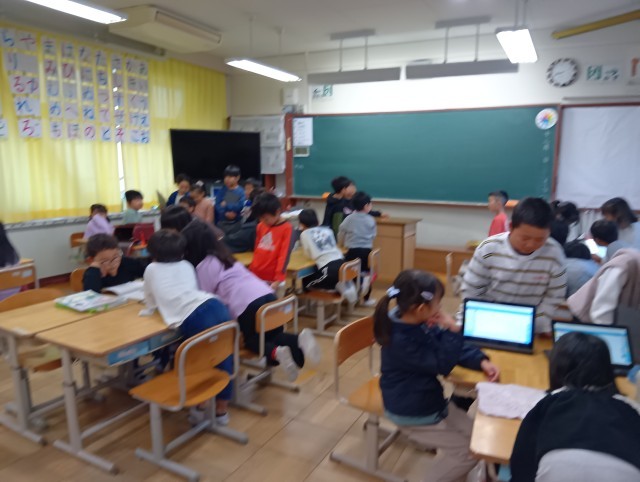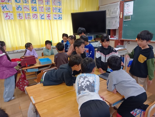 2年生が国語『ビーバーの大工事」で学習したことをクイズにしました。そして、1年生の教室に行って、クイズを出しました。パソコンでパワーポイントに問題や答え、解説をのせて1年生に問題を出していました。