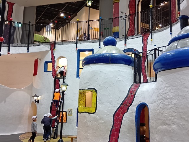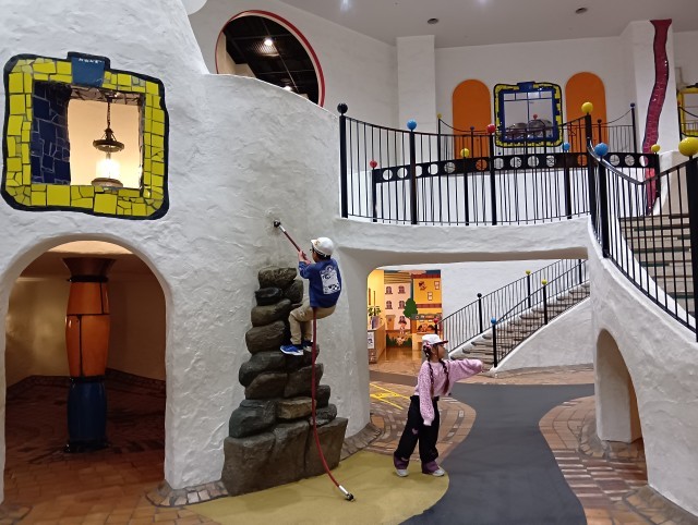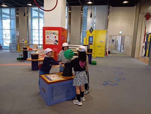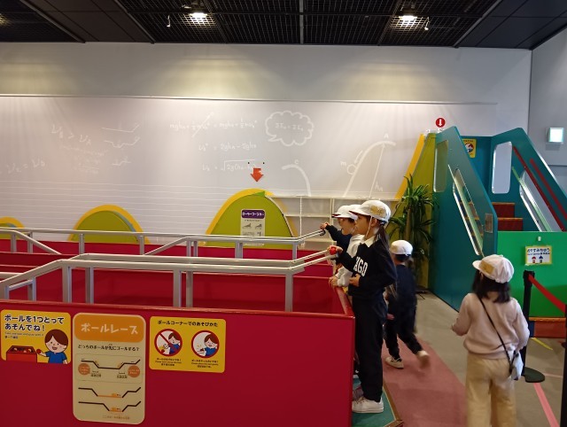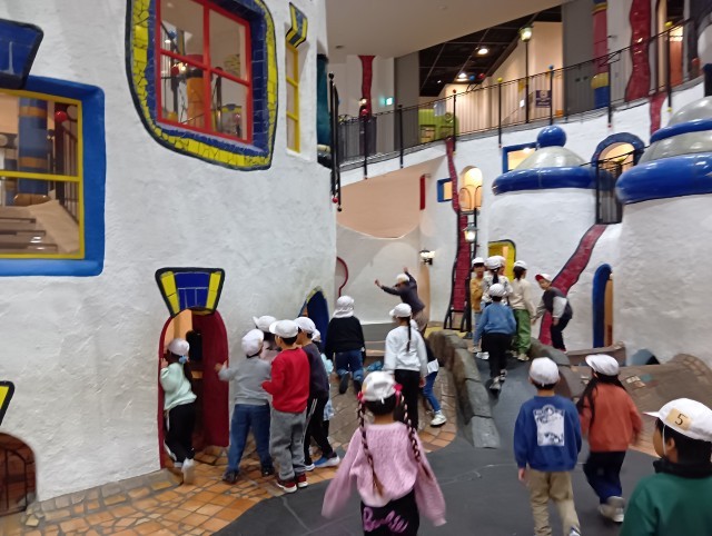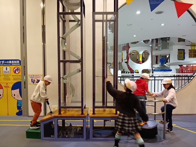 キッズプラザに着いたら、エレベーターで四階まで上がり、リュックを置いて班ごとに遊びました。先生からの注意事項をしっかり聞いて班ごとに出発です。到着が早かったおかげで最初は貸し切り状態でした。10時過ぎ頃からたくさんの団体客が加わりました。