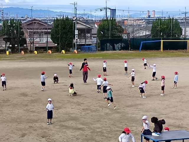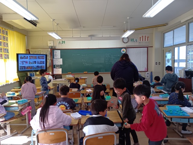 1年生は運動場で体育をしていました。先生と一緒になわとびをしていました。教室では図工で粘土を使って雪だるまなどを作っていました。