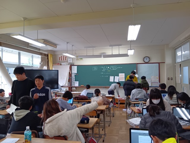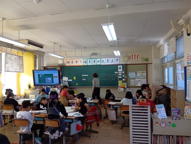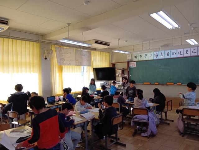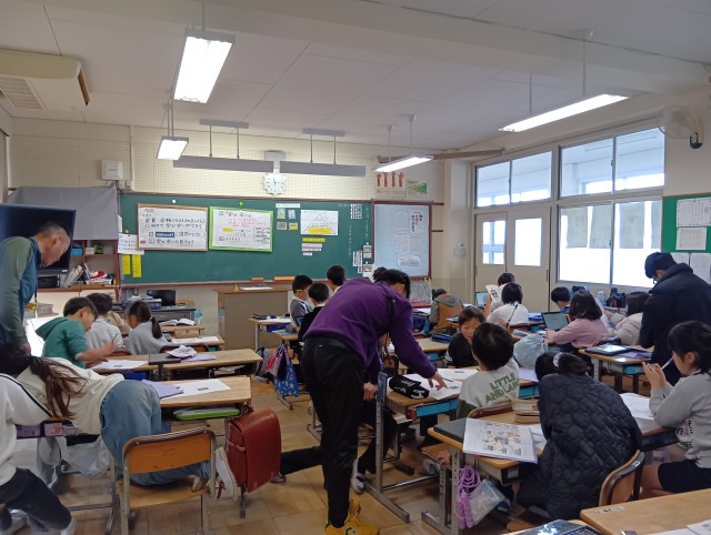 2年生は算数。3年生は算数と社会。6年生は社会と国語で、卒業アルバムの自己紹介のページを記入していました。