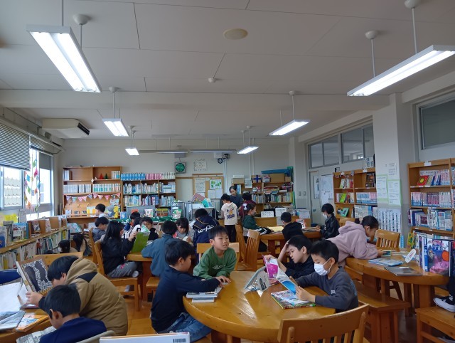 4年生は図書で、冬休みの貸し出し3冊を選んでいました。