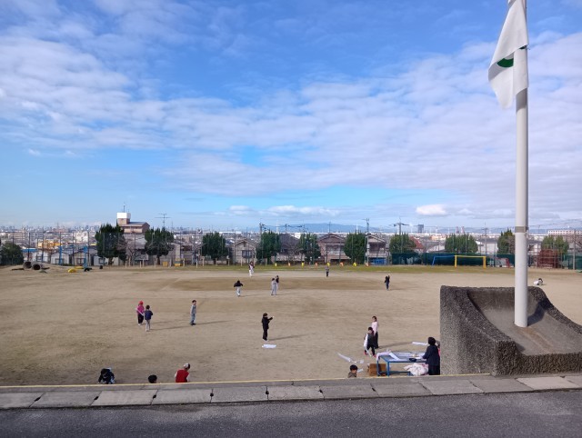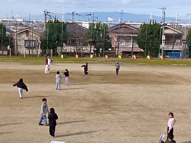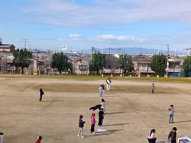 1年生が運動場で凧揚げをしていました。タコ糸がすぐに絡まってしまうので、先生は必死にほどいていました。