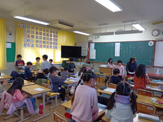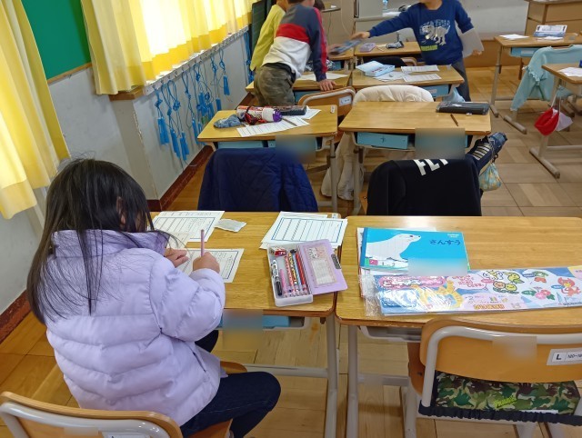 1年生の国語の授業の様子です。「小学校のことをしょうかいしよう」という単元の学習で、今までの学校生活を写真で振り返り、伝えたい事柄をカードに書いていました。「先生、17枚書いた!」と満足げに教えてくれた子どもたちでした。