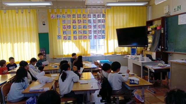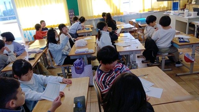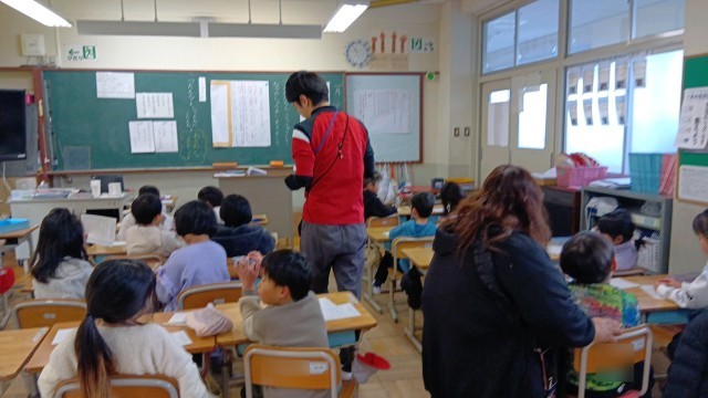 1年生の国語「新1年生に小学校のことを紹介しよう」の授業の様子です。今日は、夏の小学校生活について伝えたいことをペアで交流しました。交流時に質問されたことをメモに書いて、文章を仕上げました。子どもたちは、質問ヒントカードを見たり、黒板に書いているヒントを見ながら質問をしていました。すぐに返答できない質問をされた子もいて、「う~ん」とよく考えて答えていました。