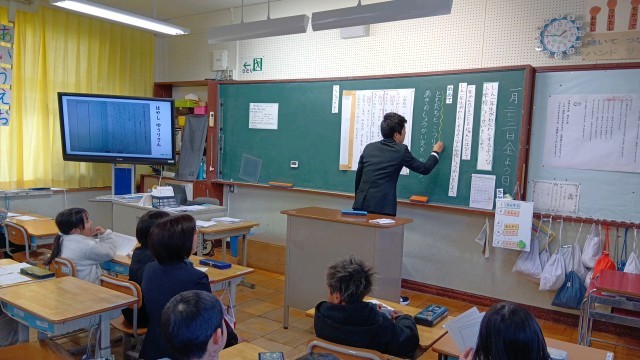 今日、1年生のクラスで国語の研究授業を行いました。国語「新1年生がわくわくするような小学校紹介をしよう」という単元です。今日の授業では、「友達と交流して、秋の紹介文をかくことができる」がめあての授業でした。紹介カードをもとにペアでカードに書いていることを伝え合いました。質問し合うことで、文の内容を豊かにしていき、ペアでの交流を活かして、「秋の紹介文」を完成させました。子どもたちは、質問ヒントカードや黒板に書かれているヒントをもとに、質問をどんどんしていました。質問されてことに答える子もしっかりと答えており、そのことを文に書きこんでいました。初めてたくさんの先生方に見られての授業でしたが、最後まで楽しく学習に臨んでいました。