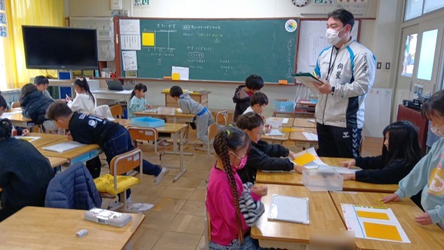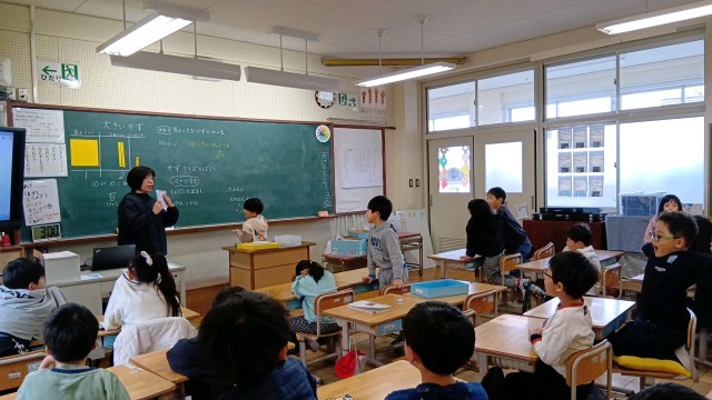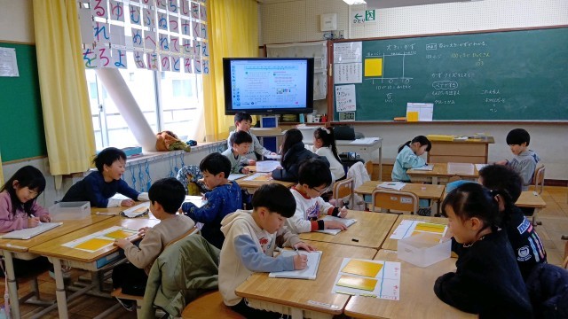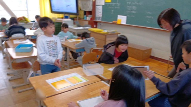 1年生の算数の授業の様子です。大きな数の学習をしていました。一の位、十の位、百の位の位のお部屋にタイルを置いて、数字に表すとどう書き、どう読むのかを学習しました。授業の後半では、ペアで問題を出し合い、楽しく習熟練習をしました。