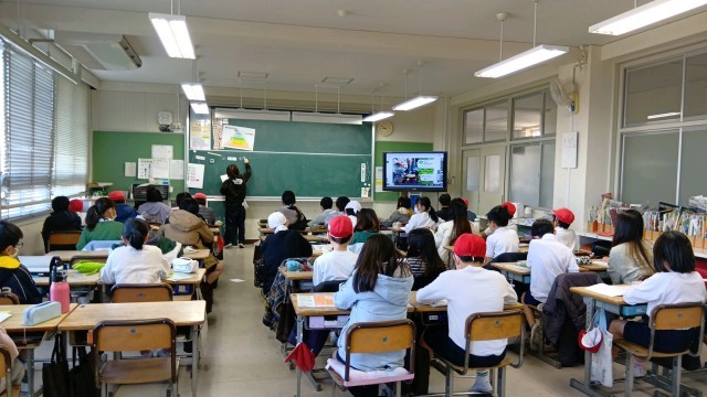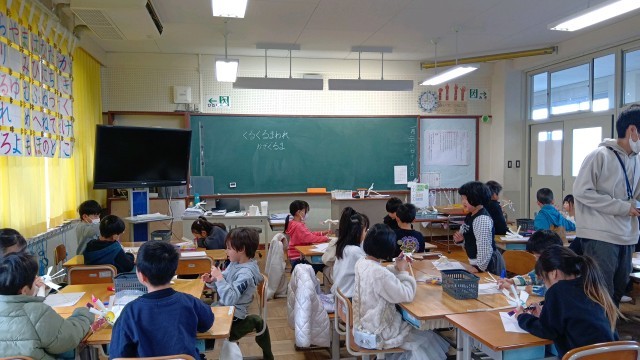 1時間目には、1年生は図工で紙コップで作った風車に色を塗っていました。4年生が外国語、5年生と6年生は算数の学習でした。
