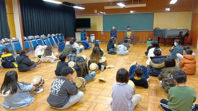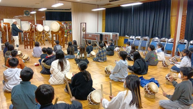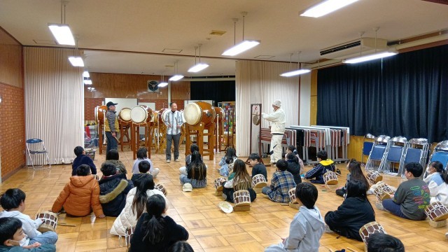 4年生が太鼓体験として、北條太鼓保存会の方に来ていただき、お話を聞きました。初め、丁ごとに違った太鼓のリズムだったものが同じにリズムに合わせていった経緯などをお話いただきました。元のリズムがどうだったのか実際に太鼓をたたいて聞かせてくれました。北條太鼓のレジェンドの方々の演奏に子どもたちは熱心に聞いていました。後半は実際に子どもたちも太鼓を一緒にたたいてみました。太鼓を通じて、地域の人々とのつながりを感じて、さらに自分の住む地域を好きになってくれればなあと思います。