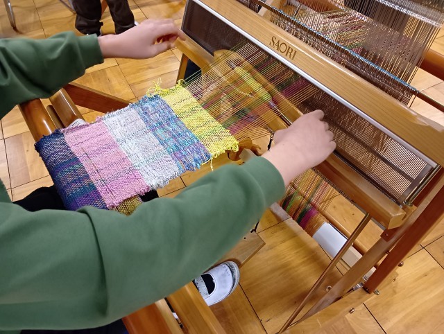 5年生の子どもたちは、自分で好きな糸を選び一人ひとり体験しました。選んだ糸によって感じが違い、一人ひとり素敵な布が織りあがりました。