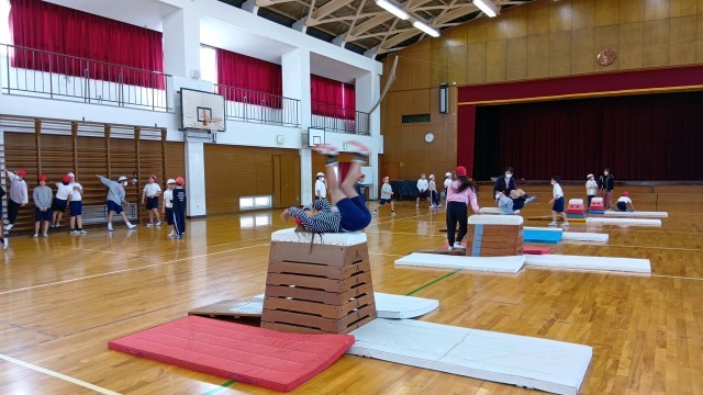 4年生は体育。跳び箱で開脚とびや台上前転を練習していました。