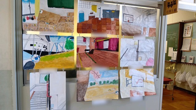 6年生の教室前に、小学校の思い出の場所を描いた作品が飾られていました。一人ひとり思い出の場所を描いており、「友達と一緒におしゃべりしながら上った階段」とか、「よく遊んだ登り棒」など、その理由も書かれています。