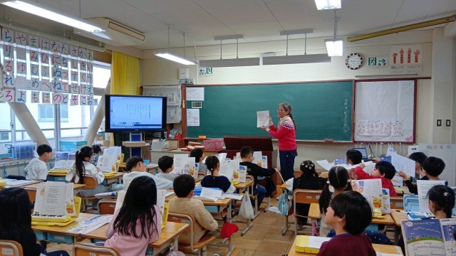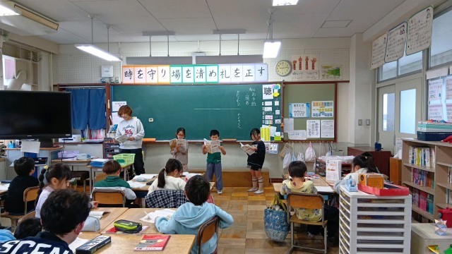 1年は国語と音楽。2年は国語。「お手紙」の音読を役割を決めて発表していました。