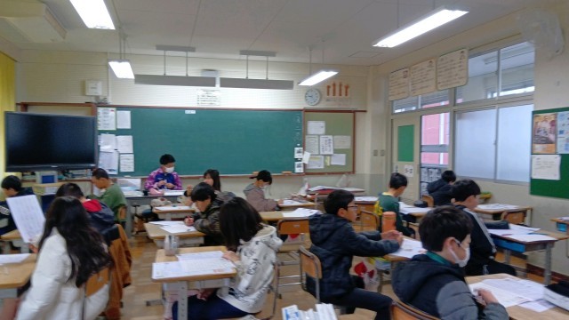 6年は社会と外国語。外国語はテストが終わったところでした。