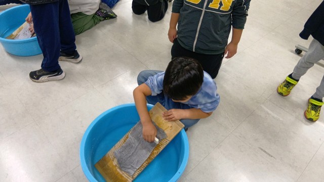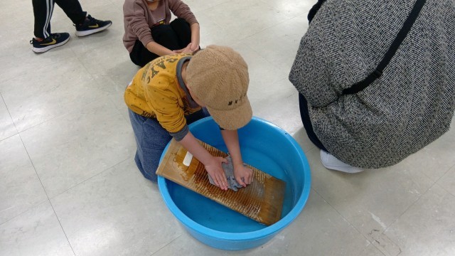 3年1組が社会科の学習で歴史民俗資料館を見学しました。昔のくらしの道具などの展示がされており、洗濯板を使った洗濯体験もしました。