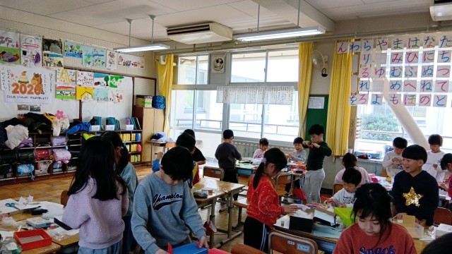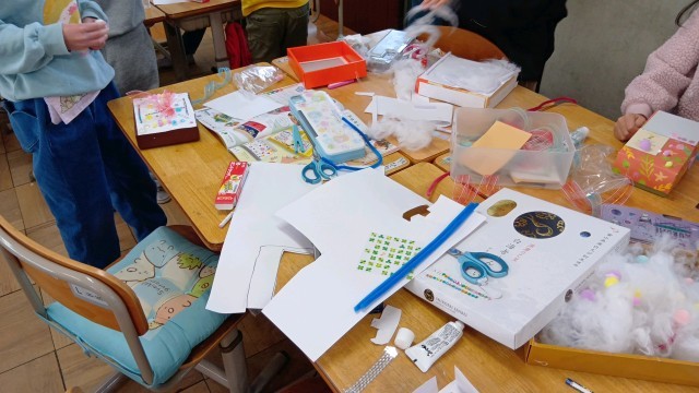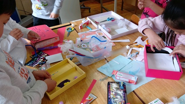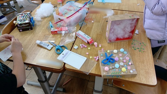 1年生が図工で箱を使って、「たからものボックス」を作っていました。キラキラをしたビーズのようなものを貼ったり、シールを貼ったり、綿をつけたりと、思い思いに箱をデコレーションしていました。