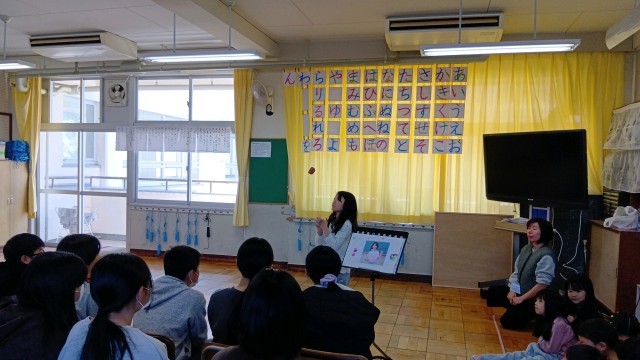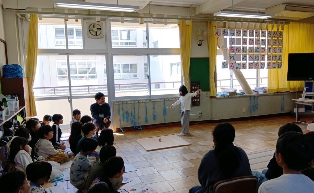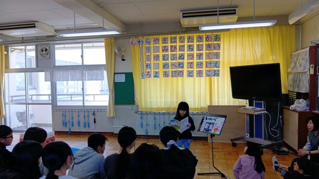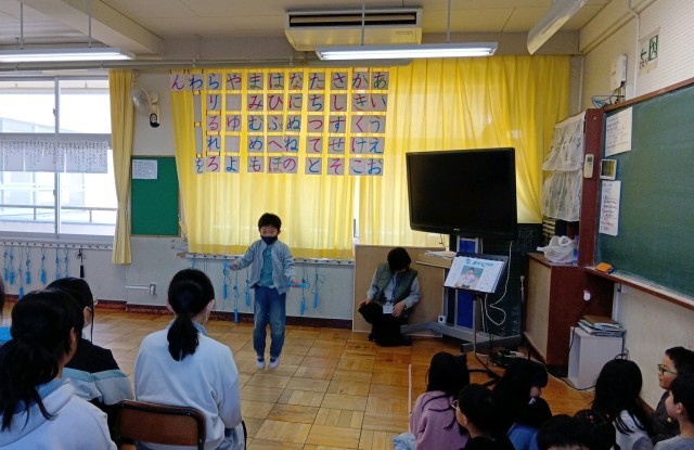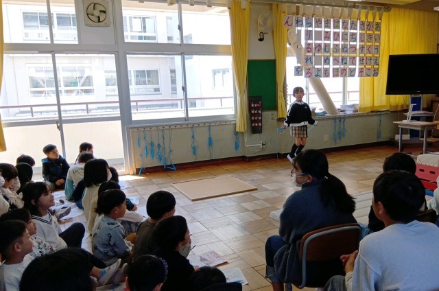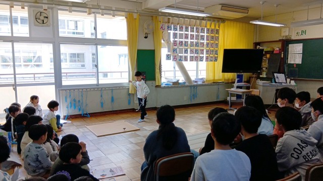 1年生が1年間でできるようになったことやがんばったことを発表しました。発表会には、6年生やコマを教えてくれた梅本さん、昔あそびを教えてくれた福祉委員さん、校内の先生たちを招待して行われました。一人ひとり、自分ができるようになったことをみんなの前で堂々と発表し、盛大に拍手をもらっていました。1年生の子どもたちの顔は達成感で満ち溢れていました。6年生は、1年生の頑張りに温かく声援を送っており、1年間に渡る1年生との関わりの密度の濃さを感じました。