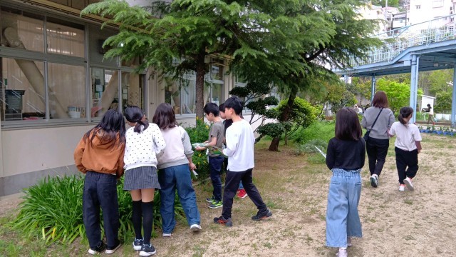 4年生は、理科で春の草花をさがしていました。先生が作ったプリントに載っている草花を探していました。