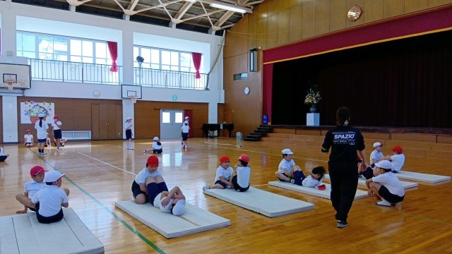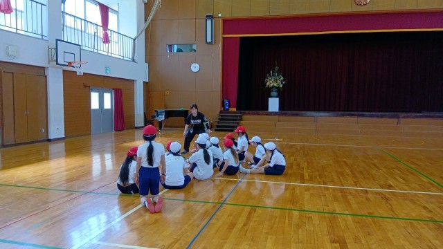 5年生は体育でスポーツテストの練習をしていました。反復横跳びの数え方など、先生が教えていました。