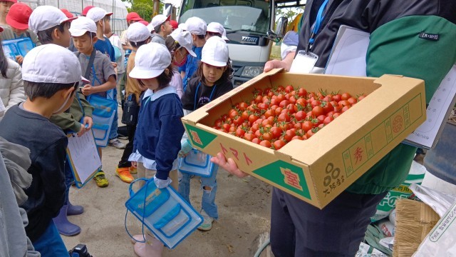 4月24日(金)、2年生が校区にある橋本ファームを訪れました。2年生は5月初旬にミニトマトを一人一鉢育てる予定です。橋本ファームでは、ミニトマトを栽培されているので、ミニトマトの育て方を詳しく質問しました。ハウスの中を見学させてもらい、ミニトマトがたくさんなっているところを見せてもらいました。お土産のミニトマトをいただき、うれしそうな子どもたちでした。
