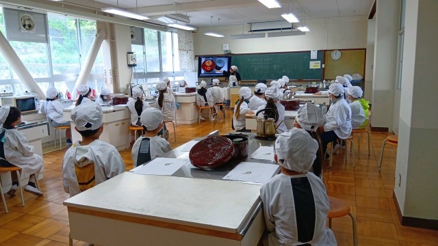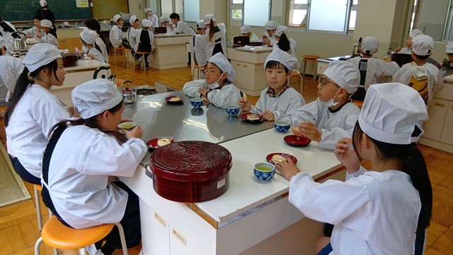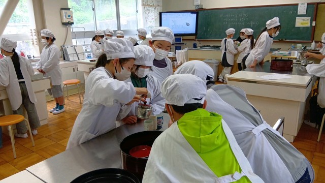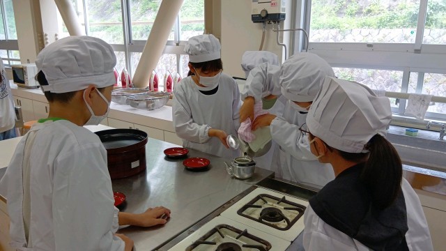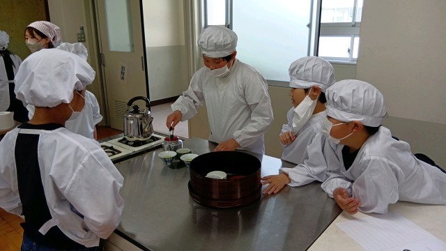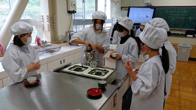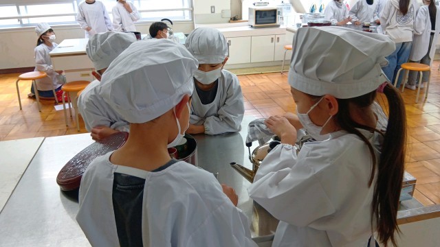 今日、5年生が初めて家庭科として調理室で実習をしました。お茶を入れて飲むというシンプルな実習ですが、ガスコンロの使い方という今後の調理実習につながる基本を学習しました。