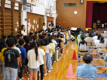 延期になっていた音楽会を開催することができました。お忙しい中、お越しいただいた保護者の皆様、地域の皆様、ありがとうございました。まずは、児童会会長の「NO MUSIC,NO HOUJO」のあいさつ、校歌をみんなで合唱してスタートです。