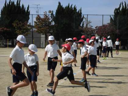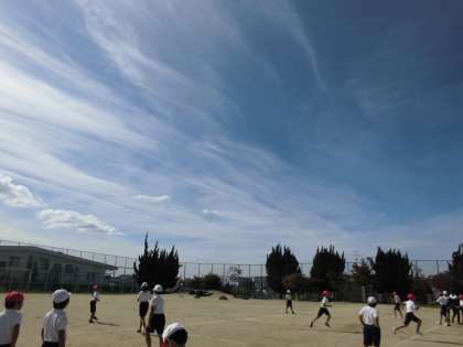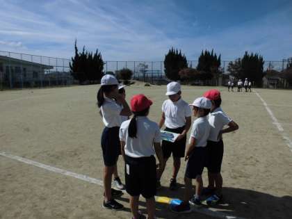 4年生は、体育でリレーに取り組んでいます。リレーはバトンパスがうまくいくかどうかで速さが違ってきます。今日は、前を向いて無駄なくバトンを受け取れるかが目標です。各グループで、「はい!」と声をかけるタイミングを練習していました。