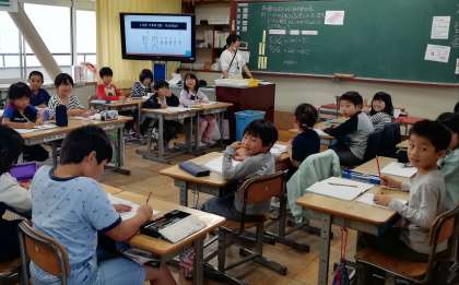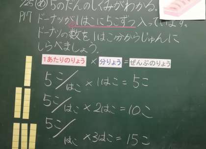 2年生が算数のかけ算、5の段の学習をしていました。ひと箱あたり5コ入のドーナッツ、2箱で5×2。