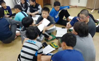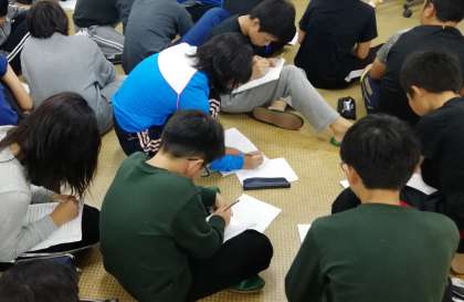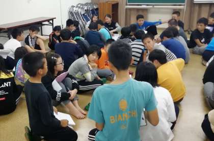 夜の集いです。今日一日の学びを振り返り、みんなで共有しました。