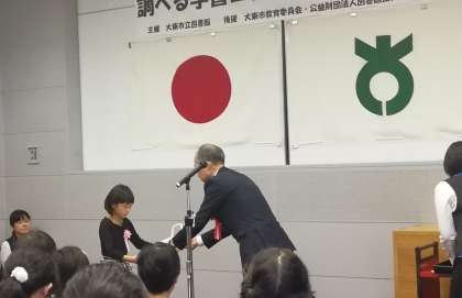 11月3日(日)、サーティホールで第4回「図書館を使った調べる学習コンクール」表彰式が行われました。市内800点近い応募作品の中から、本校から教育長賞に3年の中橋さんの作品「紙ひこうきのとび方のちがい」が選ばれました。市長賞、市議会議長賞、教育長賞に選ばれた作品は、全国のコンテストに出品されます。おめでとうございます。